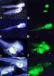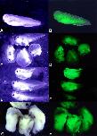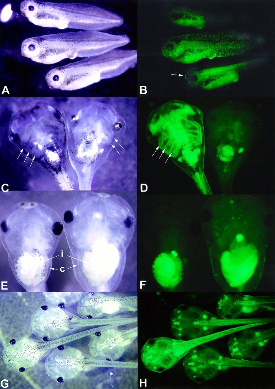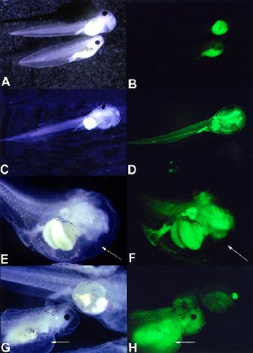 Figure 3. Stromelysin-3âgreen fluorescent protein (ST3-GFP) but not GFP is expressed extracellularly and causes developmental defects in transgenic Xenopus laevis. Tadpoles at approximately stage 45 were examined with visible light (A,C,E,G) for morphology or fluorescent light for GFP (B,D,F,H). A,B: Injections using control untreated sperm nuclei resulted in normal embryos (A) that displayed autofluorescence in their intestines (B). C,D: Transgenesis with CMV-GFP and selecting embryos that passed normally through gastrulation resulted in normal embryos (C) that expressed GFP ubiquitously (D). E,F: Some CMV-GFP embryos that did not undergo gastrulation properly (likely due to poor sperm used in transgenesis) resulted in abnormal embryos with large cavities. Although the embryos expressed GFP ubiquitously, these cavities (arrow, E and F) were free of detectable GFP. G,H: Transgenesis with CMV-ST3-GFP and selecting embryos that passed normally through gastrulation resulted in abnormal embryos (G) that expressed GFP ubiquitously (H) (note the presence of a nontransgenic embryo in G, which had normal appearance but no detectable GFP except the auto fluorescence in the intestine in H). Unlike GFP, the ST3-GFP fusion protein could be seen secreted into the extracellular cavities (arrows, G and H).