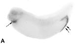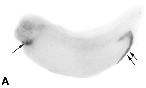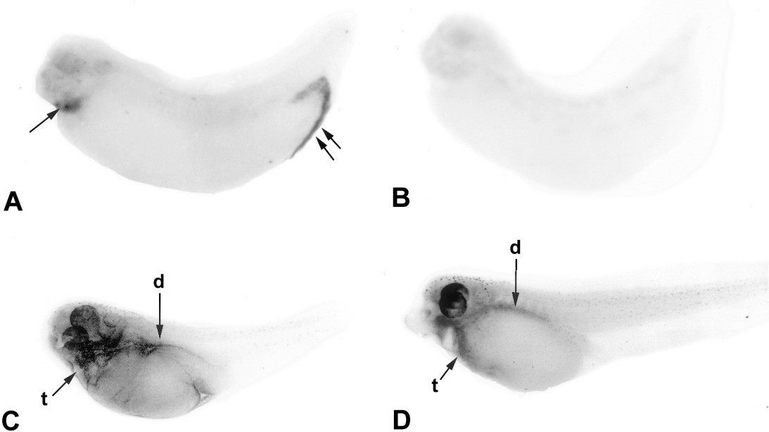 Figure 2. Stromelysin-3 (ST3) and collagenase-4 (Col4) have distinct spatiotemporal expression profiles during embryogenesis. Whole-mount in situ localization of ST3 (A,C) and Col4 (B,D) mRNA showed very restricted expression patterns during development at stages 32 (A,B) and 45 (C,D). ST3 was largely restricted to the branchial arches (A, single arrow) and dorsal posterior endoderm (A, double arrow) at stage 32 and to structures in the thorax (C, t) and the dorsal anterior axis (C, d) at stage 45. Col4 could not be detected at stage 32 (B) and was only detectable at approximately stage 45 where it was also present in the thorax (D, t) and the dorsal anterior axis (D, d), although in a somewhat different pattern compared with ST3.