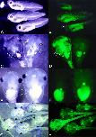 Figure 4. Transgenic overexpression of stromelysin-3 (ST3), membrane-type-5âmatrix metalloproteinase (MT5-MMP), and collagenase-4 (Col4) leads to embryonic abnormalities and death. Tadpoles at approximately stages 37â42 were examined with visible light (A,C,E,G) for morphology and with fluorescent light for GFP (B,D,F,H). Transgenesis was carried out with CMVâgreen fluorescent protein (CMV-GFP) or CMV-MMPs, and embryos that passed normally through gastrulation were selected for analysis. A,B: CMV-GFP transgenesis resulted in normal embryos (A) that expressed GFP ubiquitously (B). Note that some GFP was preferentially expressed and localized within the ciliary epithelial cells and results in a dotted staining of the surface (B). C,D: Transgenic animals with CMV-ST3-GFP, which had high levels of GFP fluorescence, were abnormal (C) and expressed ST3-GFP ubiquitously (D). These embryos often developed large edemic cavities that were full of ST3-GFP (D). E,F: Transgenic animals with CMV-MT5-GFP that expressed high levels of GFP were also abnormal (E) and expressed MT5-GFP ubiquitously (F). They also developed large edemic cavities that were full of MT5-GFP and appeared to have a dose-dependent decrease in axis length with embryos expressing the highest level of GFP having the shortest axis (top embryo, E and F). G,H: Transgenesis with CMV-Col4-GFP produced abnormal embryos (G) and expressed Col4-GFP ubiquitously (H). All embryos expressing high levels of MMP-GFP died by stage 50 or shortly after (see also Table 1).