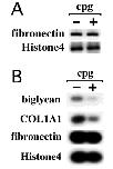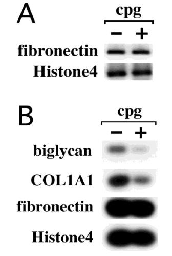 Fig. 8. Expression of Xenopus fibronectin, biglycan, and COL1A1 in cpg-injected embryos. cpg mRNA was injected into two lateral equatorial region of the two-cell embryo. A: Reverse transcriptase polymerase chain reaction at the gastrula stage (stage 11) shows that fibronectin is not affected by overexpression of cpg. B: The expression of Xenopus biglycan and COL1A1 was remarkably repressed, but fibronectin was not affected by overexpression of cpg at the tailbud stage (stage 30).