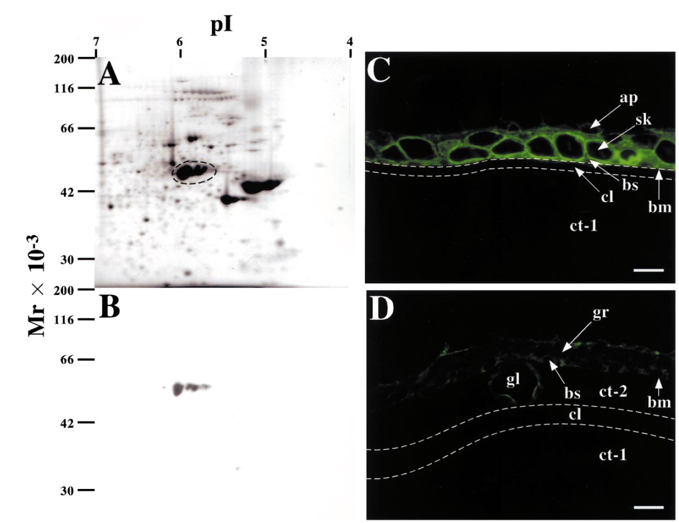 Fig. 1. Speci¢city of antibodies against XLK. Proteins of tailskin of tadpoles at stage 54 were separated by 2-D SDS^PAGE and subjected to CBB