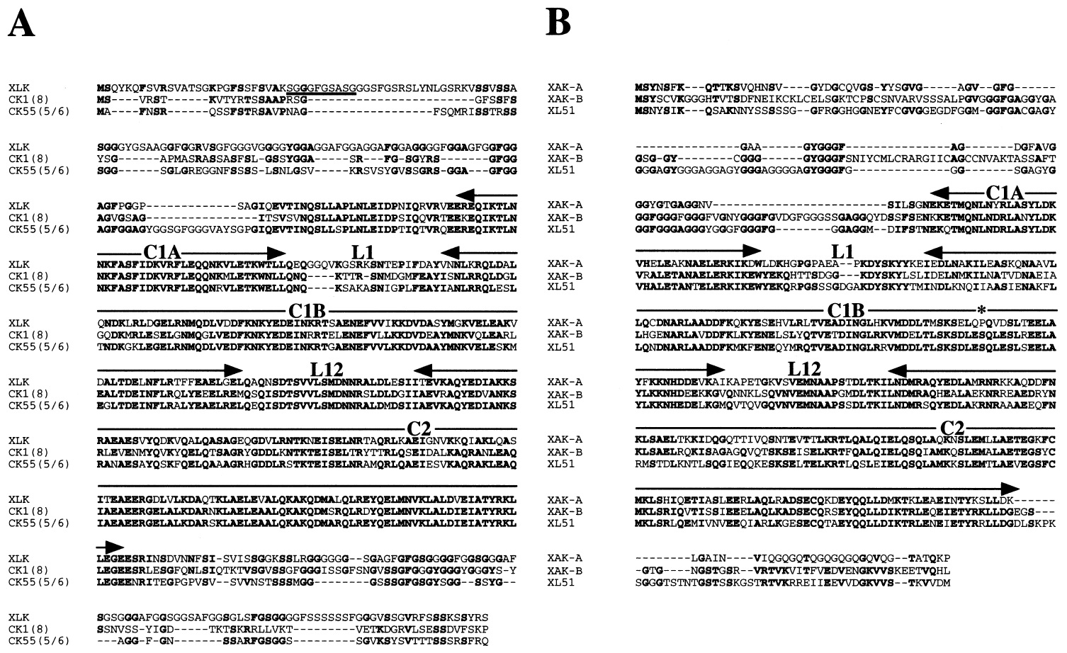 Fig. 2. The deduced amino acid sequences of XLK, XAK-A, and XAK-B. Amino acid sequences of XLK (type II keratin) are compared with other