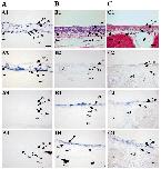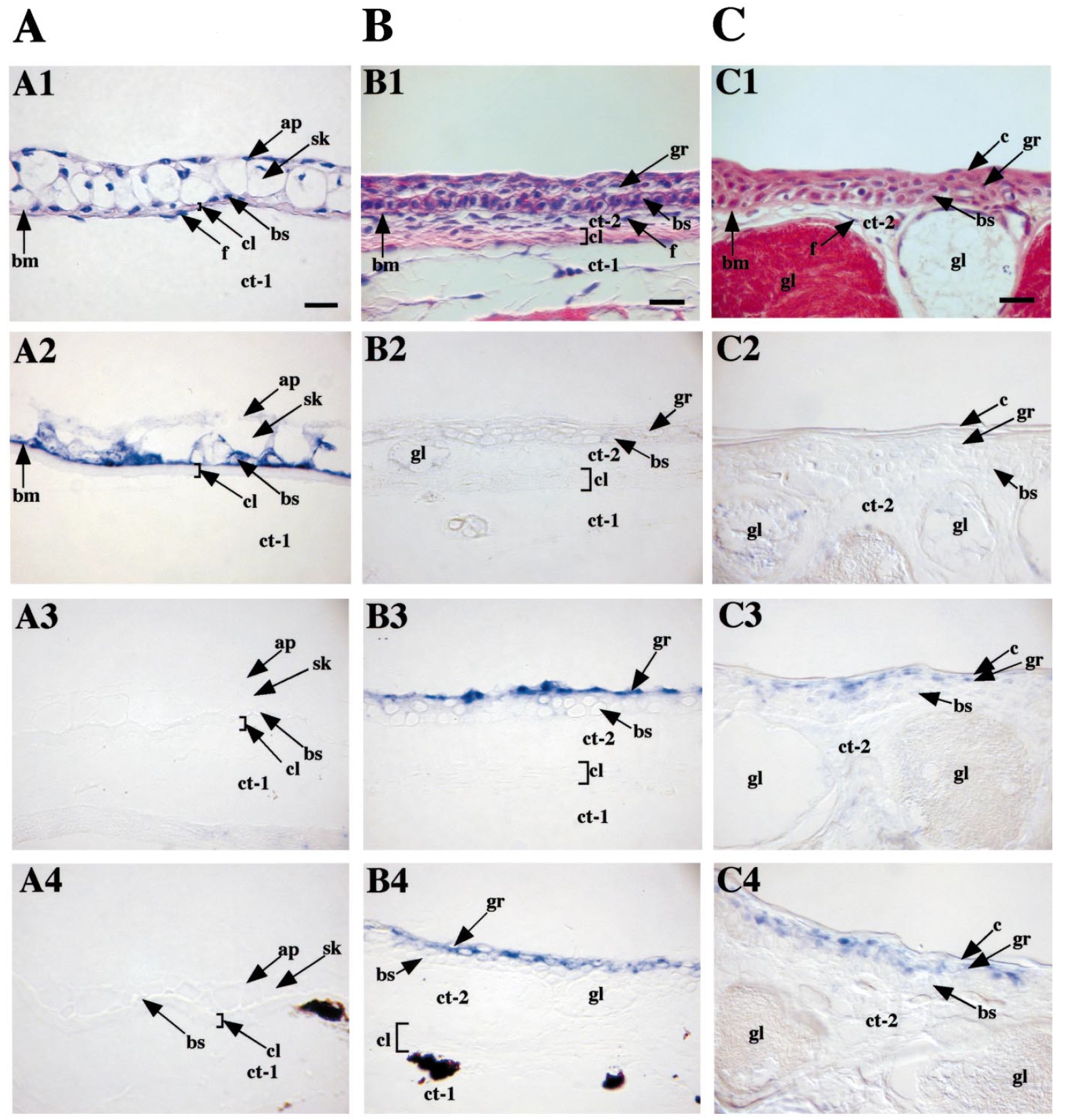 from tadpoles at stage 56 (A1^A4), stage 61 (B1^B4), and from adults (C1^C4). Histology of the skin was examined by HpE staining (A1,B1,C1). The