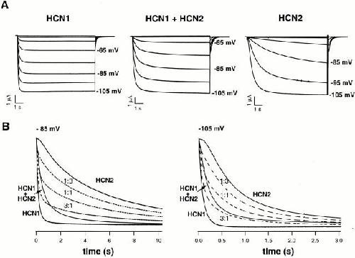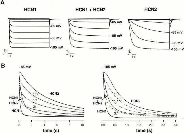 Figure 1. Coexpression of HCN1 and HCN2 results in currents recorded from intact oocytes with novel kinetics that cannot be accounted for by expression of two independent populations of homomeric HCN channels. (A) Currents recorded by two microelectrode voltage clamp elicited by 10-s hyperpolarizations in oocytes injected with cRNA of either HCN1 (left), HCN2 (right) alone, or with a 1:1 mixture of HCN1 and HCN2 (HCN1 + HCN2) (middle). Holding potential was −30 mV, and the voltage was stepped to negative potentials from −35 mV in 10-mV increments to −105 mV. Tail currents were measured at −40 mV. (B) Current traces elicited by 30-s pulses to −85 mV (bottom left) or 10-s pulses to −105 mV (bottom right) from oocytes injected with HCN1 alone, HCN2 alone, or 1:1 mixture of HCN1 and HCN2 (HCN1 + HCN2). Solid traces show normalized averaged currents from several oocytes injected with given composition of RNA. Dashed traces show algebraic sums of HCN1 and HCN2 averaged currents in ratios of 1:3, 1:1, and 3:1 (HCN1/HCN2 ratio). Four to five separate experiments (oocytes) averaged for each recording trace.