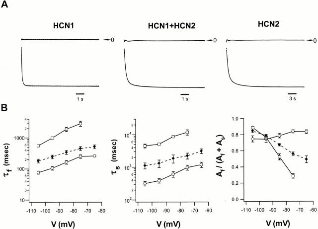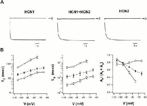 Figure 2. Activation kinetics for HCN1, HCN2, and coexpressed subunits from intact oocytes. (A) Ih currents during hyperpolarizing steps to −105 mV with superimposed fit of sum of two exponential functions (bottom traces) with residuals showing difference between data and fit (top traces). (left) HCN1 alone (10-s step); (middle) HCN1 + HCN2 (10-s step); and (right) HCN2 alone (30-s step). (B) Plot of two exponential constants as function of voltage. (left) Voltage dependence of fast exponential time constant (τf). (middle) Voltage dependence of slow exponential time constant (τs). (right) Relative amplitude of fast exponential component as function of voltage, Af/(Af + As), where Af and As are the amplitudes of the fast and slow exponential components, respectively. (open circles) HCN1; (open squares) HCN2; (closed diamonds) HCN1 + HCN2.