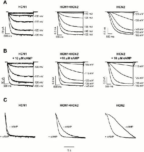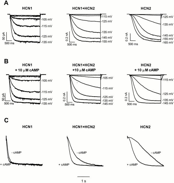 Figure 4. Coexpression of HCN1 and HCN2 gives rise to a distinct Ih phenotype in inside-out patches. (A) Currents elicited by 3-s hyperpolarizations in patches obtained from oocytes injected with cRNA of either HCN1 alone (left), HCN2 alone (right), or with a 1:1 mixture of HCN1 and HCN2 (HCN1 + HCN2) (middle). Patches were stepped to voltages ranging from −85 to −165 mV in 10-mV steps from a holding potential of −40 mV. (B) Effect of cAMP on channel activation. Currents shown for same patches with same protocols as in A, but in the presence of 10 μM cAMP. (c) Activation kinetics during a step to −135 mV in the presence and absence of 10 μM cAMP. Superimposed traces shown in A and B were scaled so amplitudes were equaled.