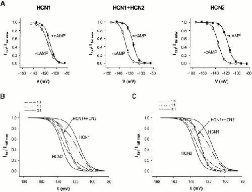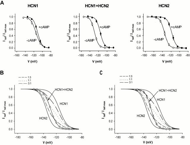 Figure 5. Steady-state activation curves determined in inside-out patches in the presence and absence of cAMP. (A) Average tail current activation curves for HCN1, HCN2, and coexpression of HCN1 and HCN2 in the presence (closed symbols) and absence (open symbols) of 10 μM cAMP. (left) HCN1 (7 patches); (middle) coexpression of HCN1 and HCN2 (9 patches); (right) HCN2 (10 patches). Solid lines show fit of Boltzmann relation. (B) The activation curve of Ih current generated by coexpression of HCN1 and HCN2 from a representative patch cannot be reproduced by linear sums of average HCN1 and HCN2 activation curves obtained from A. (solid lines) HCN2, HCN1 + HCN2 (open diamonds), and HCN1 from left to right. Dashed, dotted, and dash-dotted lines: linear sums of HCN1 and HCN2 activation curves at 1:3, 1:1, 3:1 (HCN1/HCN2) ratios. (C) The average Boltzmann activation curve for Ih currents generated by coexpression of HCN1 and HCN2 (open diamonds, 7 patches) cannot be reproduced by linear sums of average HCN1 and HCN2 activation curves. Bars indicate SEM.