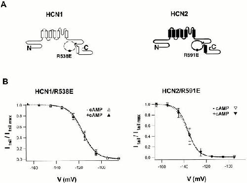 Figure 7. Mutation of a conserved arginine residue in the CNBD to glutamate prevents cAMP binding, but has no effect on the channel's intrinsic voltage dependence. (A) Diagram showing the site of the mutation. HCN1 and HCN2 are shown as six transmembrane helices (rectangles) with the P-loop connecting the fifth and sixth helices. The CNBD, located in the cytoplasmic COOH terminus, starts at the hash mark and ends at the last rectangle. It is depicted as a loop, representing the β-roll, and a rectangle, representing the C α-helix. (B) Steady-state tail current activation curves obtained in inside-out patches using 3-s hyperpolarizing steps for HCN1/R538E (left) and HCN2/R591E (right) channels. (open symbols) Data in absence of cAMP. (closed symbols) Data in presence of 10 μM cAMP. Solid and dashed curves show fits of Boltzmann relation in absence and presence of cAMP, respectively (see Table for values).