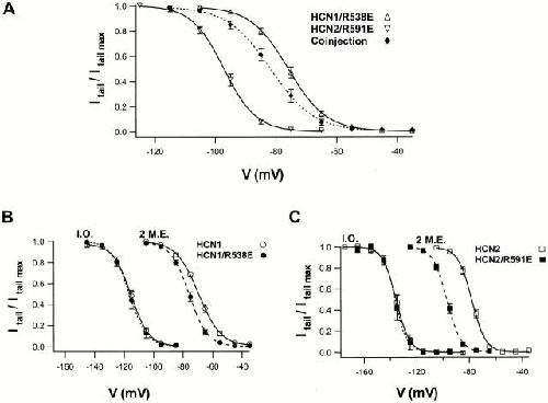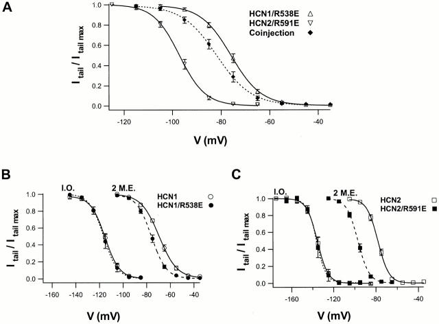 Figure 8. Comparison of effects of the arginine to glutamate point mutation on HCN channels in inside-out patches versus intact oocytes. (A) Mean steady-state tail current activation curves in intact oocytes using two microelectrode voltage clamp for HCN1/R538E channels (triangles), HCN2/R591E channels (inverted triangles), or channels formed upon coinjection of the two mutant subunits (closed symbol). Tail currents obtained after 10-s hyperpolarizing steps. (B and C), Comparisons of steady-state activation curves for wild-type (open symbols) versus mutant (closed symbols) HCN1 (B) or HCN2 (C) subunits in inside-out patches (I.O.) and intact oocytes studied with two microelectrode voltage-clamp (2 M.E.). Solid and dashed lines show fits of Boltzmann relation to wild-type and mutant subunits, respectively.
