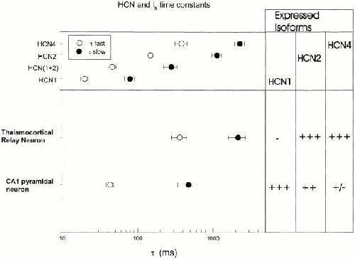 Figure 9. Comparison of recombinant and native Ih activation time constants. Fast (τfast) and slow (τslow) exponential time constants during activation of Ih for hyperpolarizing steps to −105 mV. Native Ih time constants shown for thalamocortical relay neurons and hippocampal CA1 pyramidal cells from data in Santoro et al. 2000. Relative mRNA expression levels for HCN isoforms from in situ hybridization in corresponding tissues also from Santoro et al. 2000. Data for recombinant HCN1, HCN2, and coexpression of HCN1 + HCN2 from our present study. Time constants normalized to 34°C assuming a Q10 of 4 (DiFrancesco 1993). Data for rabbit HCN4 taken from Ishii et al. 1999.