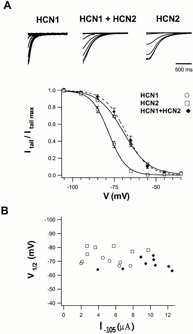 Figure 3. Steady-state activation curves for HCN1, HCN2, and coexpressed channels in intact oocytes. (A, top) Tail currents of either HCN1 alone, HCN2 alone, or coinjected HCN1 and HCN2. (bottom) Averaged, normalized steady-state tail current activation curves were obtained using 10-s hyperpolarizing steps for HCN1 currents (open circles, 8 cells) and currents produced by coexpression of HCN1 and HCN2 (closed diamonds, 9 cells); 30-s hyperpolarizing steps were used for HCN2 currents (open squares, 8 cells). Curves show fit of Boltzmann relations (see materials and methods for details). Bars show SEM. (B) Relation of steady-state V1/2 and Ih current amplitude at the end of 3-s hyperpolarizing step to −105 mV. Each symbol shows data recorded for an individual oocyte injected with HCN1 (open circles), HCN2 (open squares), or HCN1 + HCN2 (closed diamonds).