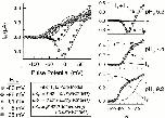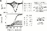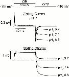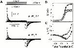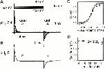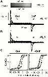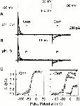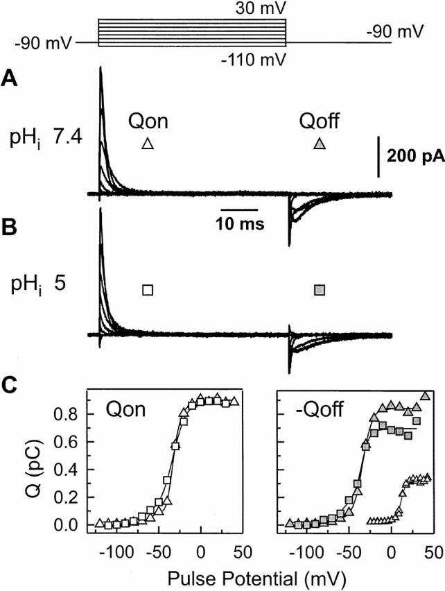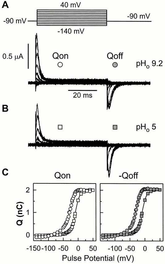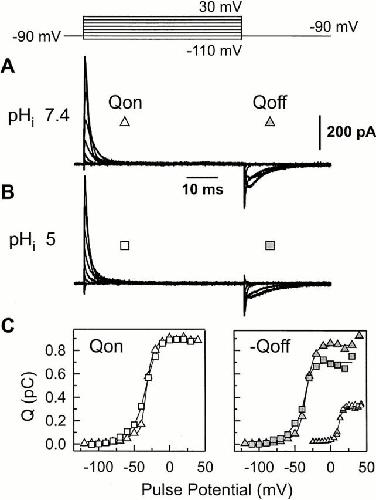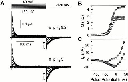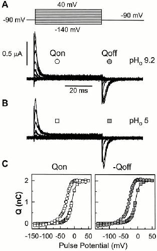 Figure 12. Gating currents of the E283Q/R371H channel. (A) Using the cut-open oocyte voltage clamp, E283Q/R371H channel gating currents were measured in symmetric NMDG-MS solutions with internal pH 9.2, and either pHo 9.2 (top currents) or pHo 5 (bottom currents). All gating currents were recorded from the same membrane area. The gating currents in each pHo group (shown superimposed) were elicited by the pulse protocol series shown at the top. (B) Q-V curves for the ON- (open symbols) and OFF-gating currents (closed symbols) displayed in A (pHo 9.2, circles; pHo 5, squares). (C) The voltage dependence of steady-state ON-gating currents shown in A (circles, pHo 9.2; squares, pHo 5). The linear leak component has already been subtracted out, as described in materials and methods (Data Analysis of I-V Curves). (Experiment D11037a)