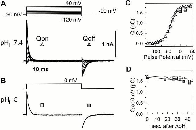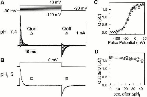 Figure 5. Gating charge displacement in the K374H channel is unaffected by internal protons. (A) Gating current records from the K374H channel measured from an excised inside-out macropatch in symmetric NMDG-MS solutions, pH 9.2 in the outside and pH 7.4 in the inside (pHi). The superimposed currents are in response to various test pulses from a holding potential of −90 mV, shown superimposed at the top. (B) Gating current in response to a 0 mV test pulse from the same macropatch during perfusion of pHi 5 internal solution. (C) Q-V curves for the ON- (open symbols) and OFF-gating currents (closed symbols) displayed in A (pHi 7.4, triangles). Each Q-V curve was fit to a sum of two Boltzmann distributions (lines). The internal side was perfused with pHi 5 solution, and test pulses to 0 mV were intermittently applied 20 s later to measure the saturating charge displacement. A test pulse to 20 mV was also applied once to confirm saturation of charge displacement. The average of the charge displaced in the ON- and OFF- gating currents from seven of these 0-mV test pulses and the 20 mV pulse during pHi 5 perfusion are shown (squares). (D) Qon (open symbols) and Qoff (closed symbols) in response to 0 mV test pulses measured in pHi 7.4 (triangles) and during internal pHi 5 perfusion (squares). The lines through the data are linear regressions. (Experiment D11077b)