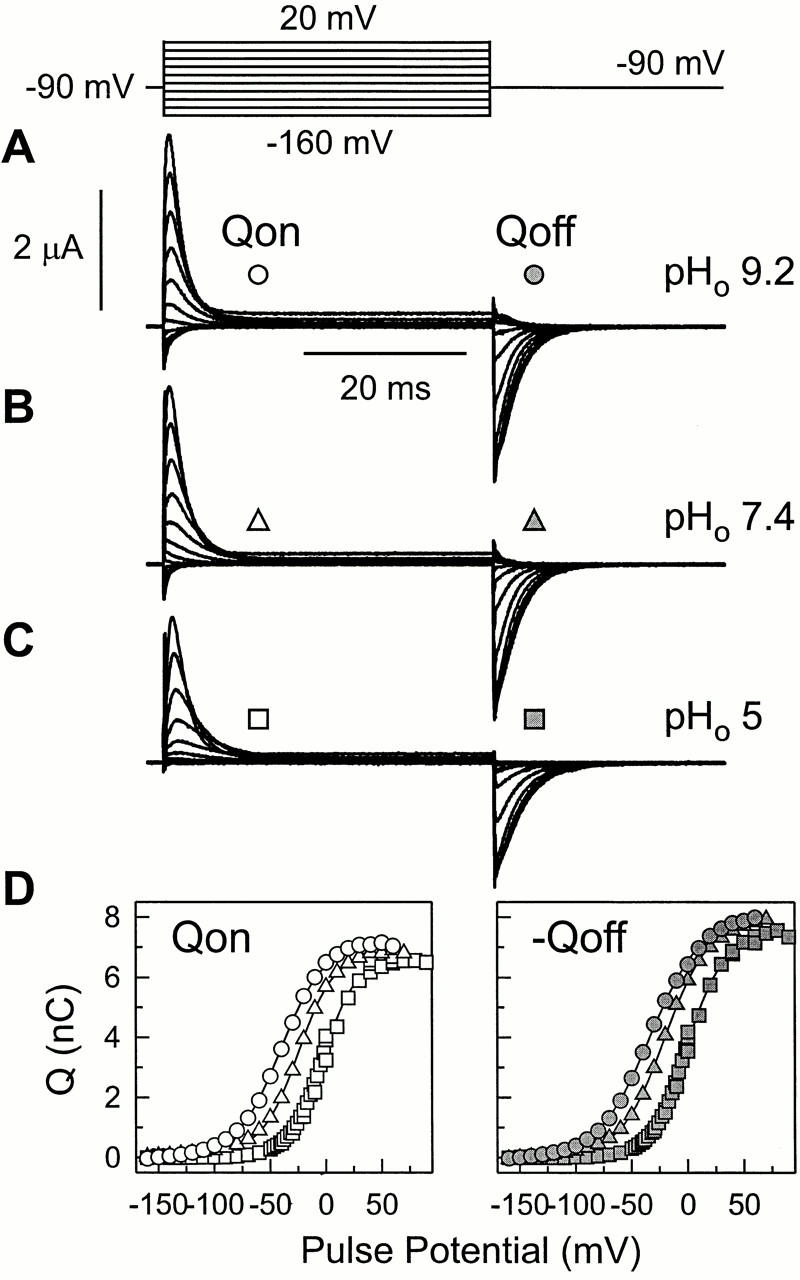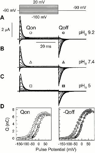 Figure 6. Gating charge displacement in the K374H channel is unaffected by external protons. (A) Gating current records from the K374H channel measured in the cut-open oocyte configuration in symmetric NMDG-MS pH 9.2 solutions (pHi 9.2 and pHo 9.2). The superimposed currents are in response to various test pulses from a holding potential of −90 mV, also shown superimposed at the top. (B) The same sequence of superimposed gating current records from the same oocyte in pHo 7.4 external solution. (C) The same sequence of superimposed gating current records from the same oocyte in pHo 5 external solution. (D) Q-V curves for the ON- (left panel, open symbols) and OFF-gating currents (right panel, closed symbols) displayed in A (pHo 9.2, circles), B (pHo 7.4, triangles), and C (pHo 5, squares). (Experiment D06088a)