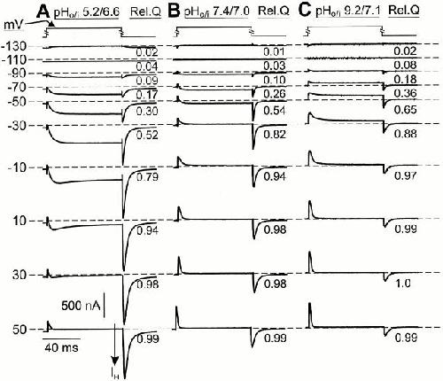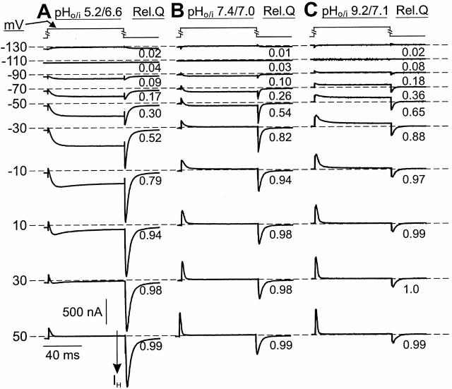 Figure 7. Gating currents of the R368H channel displace titrateable charge and transport protons. Using the cut-open oocyte voltage clamp, R368H channel gating currents were recorded in internal HB solution, pH 7.4, and various external HB solutions (A, pHo 5.2; B, pHo 7.4; C, pHo 9.2). The intracellular pH (pHi) was measured with a H+-sensitive electrode. All gating currents were recorded from the same membrane area. The gating currents in each pHo group were elicited by a family of test pulses (in millivolts) from a pre- and postpotential pulse of −110 mV (represented at the top of each group). The test pulse value corresponding to each current is shown on the left. The normalized charge displacement in each gating current (Rel. Q, shown to the right of each trace) was obtained by integrating the OFF-gating currents (Fig. 9 B) and normalizing to the maximum value of each pHo group. Linear leak current was subtracted from each current trace off-line as described in materials and methods (Data Analysis of I-V Curves). (Experiment D11200a)