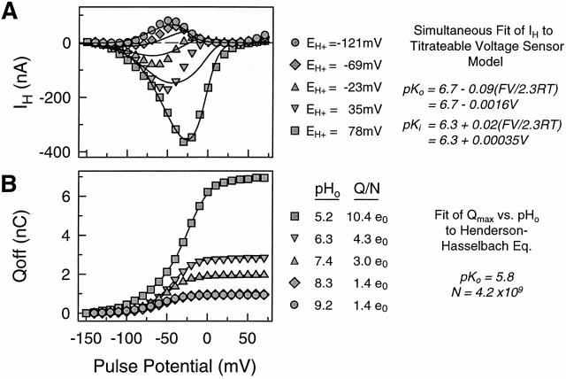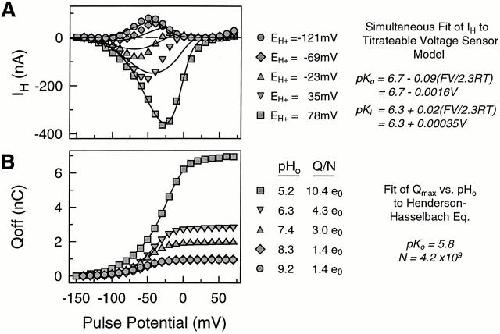 Figure 9. Voltage dependence of proton transport and gating charge displacement in the R368H channel. A family of pulse-evoked R368H channel gating currents and pHi were simultaneously measured in five different pH gradients across the membrane, as described and shown for three of the gradients in Fig. 7. pH gradients were established using HB recording solutions by leaving the internal solution constant and varying pHo: pHo/pHi 5.2/6.6 (âª), pHo/pHi 6.3/6.9 (â¾), pHo/pHi 7.4/7.0 (â´), pHo/pHi 8.3/7.1 (â¦), and pHo/pHi 9.2/7.1 (â¢). (A) Voltage dependence of steady-state proton current amplitudes in five pH gradients (proton transport I-V curves). The Nernst equilibrium potential established by each pH gradient, EH+, is also displayed. All five proton current I-V curves were simultaneously fit to an expression for proton current values predicted from a titrateable voltage sensor model (see theory, second term of ) with voltage-dependent pKas (). The best fit values for pKo and pKi are shown in two forms: first, pK(V) = pK(0) ± δ(FV/2.3RT) to highlight δ, the fraction of the electric field sensed, followed by pK(V) at room temperature to highlight the slope of the voltage dependence, where V is in units of millivolts. Other parameters of the fit are: N = 1.82e10, z = 3.09, z1= 0.061, δα1 = 0.012, δα2 = 0.376, α1(0) = 8464/s, α2(0) = 67215/s, and β1(0) = 4775/s. (B) Corresponding Q-V curves for the OFF-gating currents in five pH gradients. Total gating charge per channel (Q/N) was estimated by fitting Qmax versus pHo to the Henderson-Hasselbach equation (Q/N = Qmin + {(Qmax â Qmin)/[1 + exp[2.3(pHo â pKo)]]}). The fit predicted a pKo of 5.8 and saturated at a maximum value of 8.37 nC. Assuming that the fully protonated voltage sensor displaces 12.5 e0 per channel as the wild-type, N = 8.37 nC/12.5 e0 = 4.2e9. (Experiment D11200a)