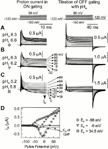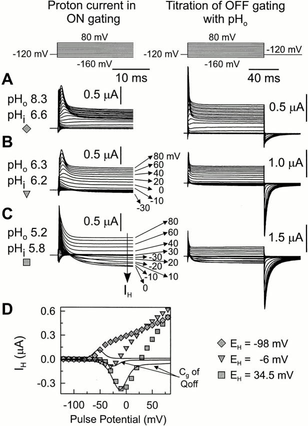 Figure 10. Gating currents of the R371H channel. Using the cut-open oocyte voltage clamp with a H+ sensitive electrode, R371H channel gating currents and pHi were simultaneously measured in three pH gradients: pHo/pHi 8.3/6.6 (A), pHo/pHi 6.3/6.2 (B), and pHo/pHi 5.2/5.8 (C). The gradients were established with HB recording solutions; the external solution was varied while the internal pH 5 solution was left unchanged. All gating currents were recorded from the same membrane area. The gating currents in each pHo/pHi group (shown superimposed in A–C) were elicited by the pulse protocol series shown at the top. The left panel of A–C is an enlargement of the ON-gating currents shown fully in the right panel. Linear leak current was subtracted from each current trace off-line as described in materials and methods (Data Analysis of I-V Curves). (D) Voltage dependence of steady-state proton current amplitudes (proton current I-V curves) measured in three pH gradients: pHo/pHi 8.3/6.6 (♦), pHo/pHi 6.3/6.2 (▾), and pHo/pHi 5.2/5.8 (▪). IH was determined by taking the isochronal, steady-state amplitudes of the ON-gating currents shown in A–C. The linear leak component has already been subtracted out as described in materials and methods. The Qoff-V curve associated with each I-V curve was used to generate the voltage dependence of the gating capacitance, Cg. Each Cg-V curve (lines) was scaled to its associated I-V curve. (Experiment D11210b)