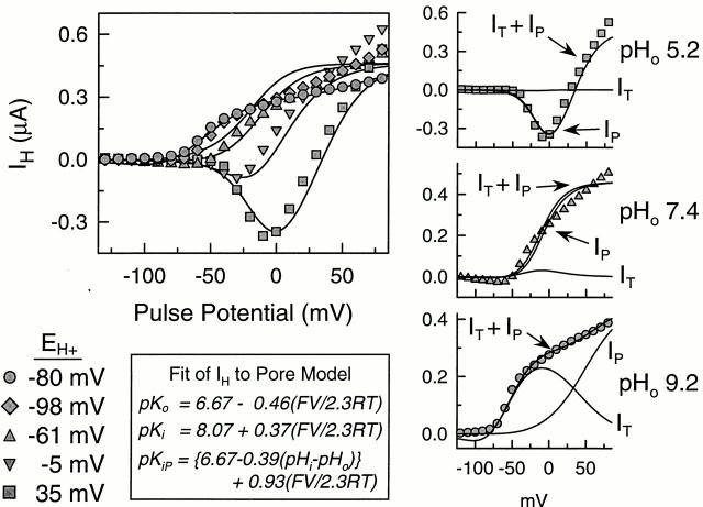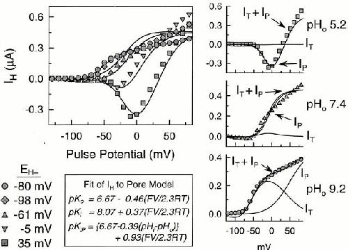 Figure 11. Proton transport and conduction by the R371H channel voltage sensor. I-V plots of the steady-state proton currents, IH, measured in five different pH gradients: pHo/pHi 9.2/7.8 (•), pHo/pHi 8.3/6.6 (♦), pHo/pHi 7.4/6.34 (▴), pHo/pHi 6.3/6.2 (▾), and pHo/pHi 5.2/5.8 (▪). The Nernst equilibrium potential established by each pH gradient, EH+, is also displayed. Gating currents and pHi were measured simultaneously as described and shown for three of the gradients in Fig. 10. All five proton current I-V curves were simultaneously fit to an expression for proton current values (see theory, ) predicted from a model of a titrateable voltage sensor that forms a proton pore upon depolarization. The proton current predicted by the model is the sum of a proton transport current, IT, and a proton pore current, IP. The parameters of the best fit to the model (shown as lines) are: pKo(0) = 6.67, pKi(0) = 8.07, δo = 0.460, δi = 0.373, δip = 0.934, γo = 93.5/s, ɛo(0) = 4.33e8/(M s), γip = 138/s, N = 3.08e10, z = 1.14, z1 = 0.844, δα1 = 0.139, δα2 = 0.879, α1(0) = 7247/s, α2(0) = 818/s, and β1(0) = 2,369/s. (Experiment D11210b)