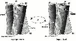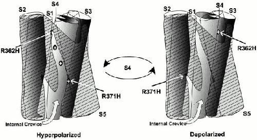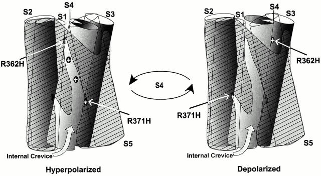 Figure 13. A model of voltage sensor operation. A model illustrating the movement of the Shaker K+ channel S4 segment from a hyperpolarized position (left) to a depolarized position (right). Only five transmembrane segments (S1–S5) of one subunit are shown for clarity. The hydrophobic region surrounding the internal crevice is represented as a hatched cloud shaped by the membrane and the sides of S1 and S5 facing each other. Depolarization causes a rotation of the S4 segment and movement of the first four S4 charges from the internal crevice to an externally facing crevice. The external crevice cannot be seen; it faces the back between the S2 and S3 segments.