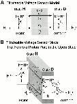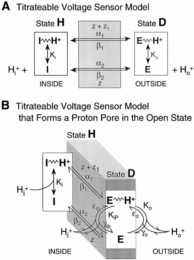 Figure 1. Titrateable voltage sensor models. (A) Gating currents were modeled as transitions between H and D connected by voltage-dependent rate constants α and β. The charge carried by the titrateable voltage sensor in each transition between H and D is either z or z + z1, as determined by the equilibrium dissociation constant, pK (Ki or Ko), of the titrateable group and the surrounding pH (Hi+ or Ho+ if the titrateable group gets exposed to the internal or external solution, respectively). Since the S4 segment, which contains most of the voltage sensing residues, is positively charged, depolarization of the membrane (gray box) moves the voltage sensor from the inside of the membrane towards the outside, thereby moving charge z or z + z1, in the transition. (B) The titrateable voltage sensor model shown in A was extended to incorporate the formation of a one-ion proton pore at depolarized potentials. In the D states, the titrateable residue has access to both the internal and external solutions simultaneously, and this creates a proton pathway through the membrane. Proton binding in the D states from the external solution depends on the dissociation constant, pKo (Ko = γo/Éo) and the external pH (Ho); binding from the internal solution depends on pKiP (KiP = γip/Éip) and pHi.