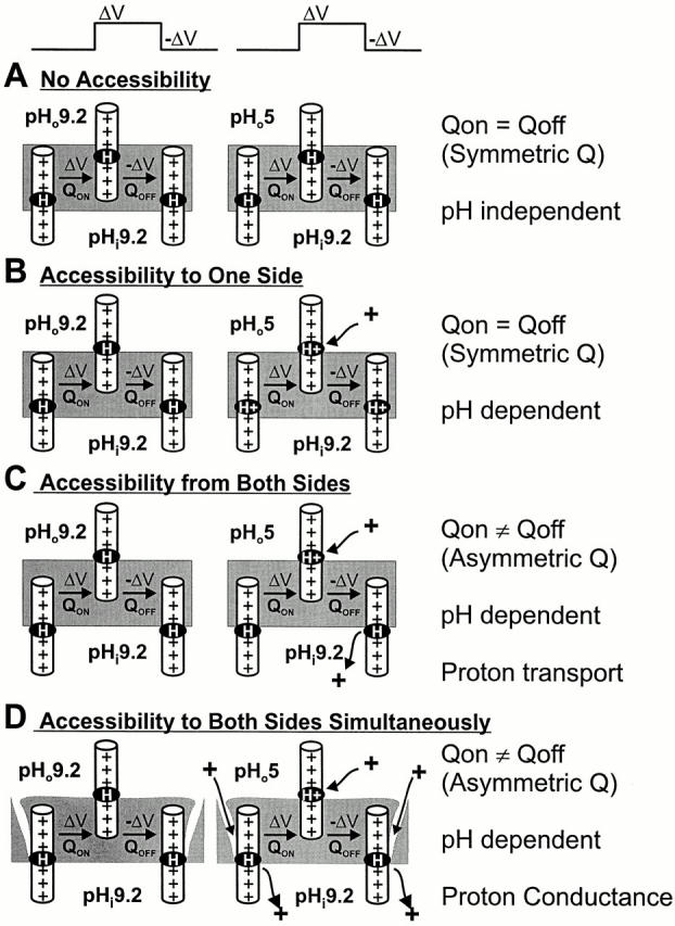 Figure 2. Histidine scanning mutagenesis. The various experimental outcomes of histidine scanning mutagenesis (summarized in text on the right) depend on the accessibility of the histidine (H, unprotonated; H+, protonated) to solution protons during gating. Histidine accessibility during gating is monitored as pH-dependent changes in the gating charge displacement (Q) evoked by membrane potential pulses (shown at top). A depolarizing pulse (ΔV) moves the positively charged voltage sensor (represented as a cylinder) from the inside of the membrane (gray box) towards the outside, thereby displacing gating charge Qon. Repolarization (−ΔV) returns the gating charge Qoff. If the histidine is part of the voltage sensor, modulation of Qon by the internal pH (pHi) indicates internal exposure and modulation of Qoff by the external pH (pHo) indicates external exposure. The relationship between Qon and Qoff is shown schematically in pHo/pHi 9.2/9.2 (left) and in pHo/pHi 5/9.2 (right) for four different histidine exposure possibilities.