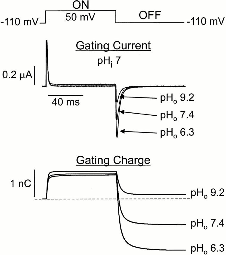 Figure 8. Titration of gating charge displacement in the R368H channel. The gating currents in response to a 50-mV test pulse, were recorded in three pH gradients from the same oocyte described in Fig. 7. The current records are shown here superimposed along with the corresponding gating charge displacement obtained by integrating the gating currents over the duration of the ON and OFF potential pulses. (Experiment D11200a)