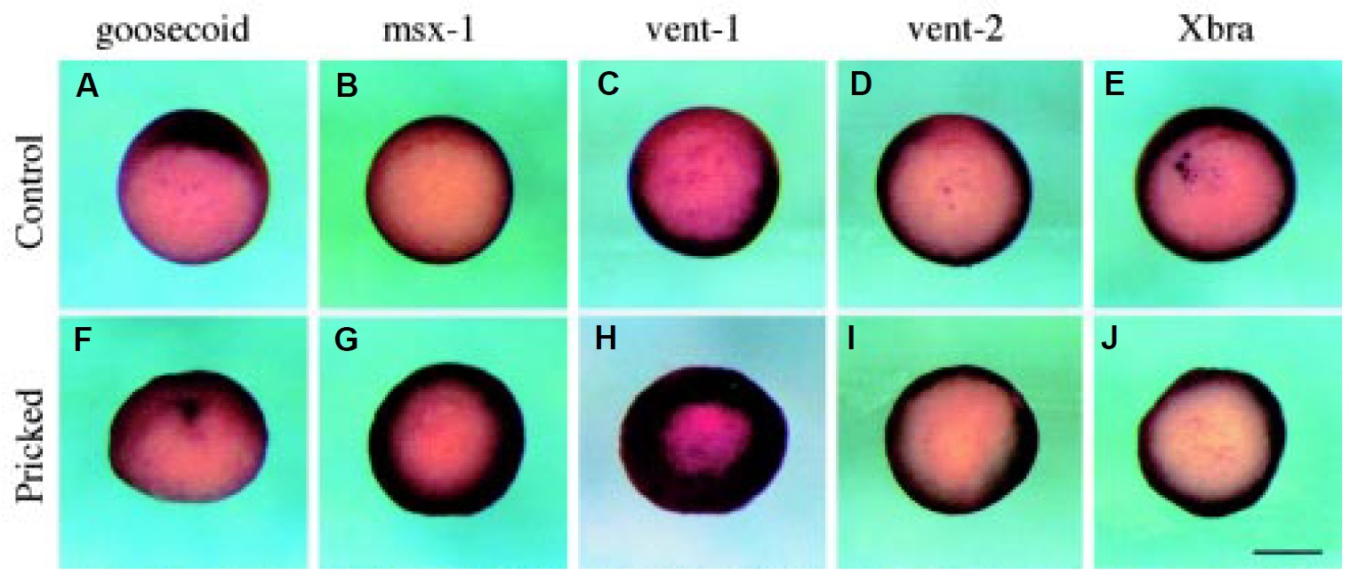 panmesodermal markers. Expression of goosecoid (A,F), Xmsx-1 (B,G), vent-1 (C,H), vent-2 (D,I) and Xbra (E,J) was examined in control (A-E) and