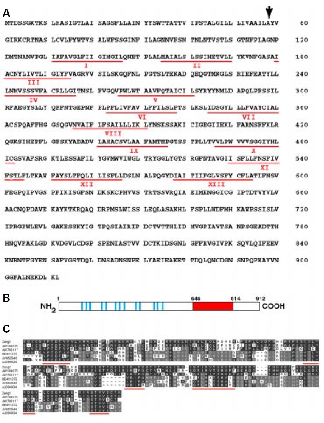 Schematic representation of Xwig1. Indicated are the putative transmembrane regions (blue) and the
