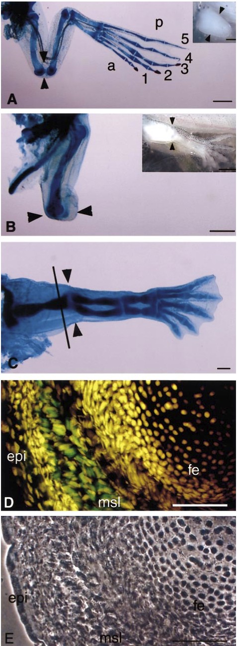 FIG. 1. Regenerative capacity and differentiation of Xenopus limb buds. (A) A complete regenerate from a stage 52 limb bud. Upper inset shows a stage 52 limb bud. Note that only anterior digits (1, 2, 3) have claws. (B) A sample after amputation of stage 56 limbs. No regenerates were formed. Upper inset shows a stage 56 limb. (C) Cartilage staining shows that the cartilage pattern is almost completely formed at stage 56. The line indicates the plane of a section of the stage 56 limb bud shown in (D). (D) Muscle differentiation at the amputation level of a stage 56 limb bud. MF20 staining (green) shows that many well-differentiated muscle cells have already migrated to the amputation site. (E) Phase-contrast photograph of (D). a, anterior; p, posterior; epi, epidermis; msl, muscle cells; fe, femur (cartilage). All arrowheads indicate ampu-tation level (knee level). Bars, 1 mm for (A), (B), and upper inset in (B); 250um for upper inset in (A) and (C);50um for (D) and (E).