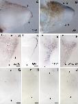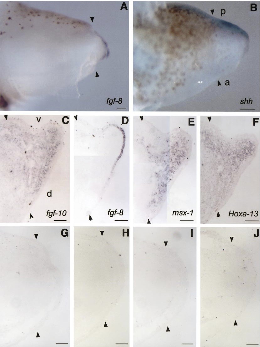 FIG. 3.Gene expressions in FGF-10-treated blastemas. (A) fgf-8 expression in an FGF-10-applied stage 56 limb 3 days after amputation. (B) shh expression in an FGF-10-applied stage 56 limb 8 days after amputation. (C) Gene expressions in an FGF-10-applied stage 56 limb 8 days after amputation. fgf-10 (C), fgf-8 (D), msx-1 (E), and Hoxa-13 (F) expressions were examined by in situ hybridization in serial sections. (G) Gene expressions in a PBS-applied stage 56 limb 8 days after amputation. fgf-10 (G), fgf-8 (H), msx-1 (I), and Hoxa-13 (J) expressions were not induced by the PBS-soaked beads. a, anterior; p, posterior; d, dorsal; v, ventral. All arrowheads indicate amputation level (knee level). Bars, 100 ï°m.
