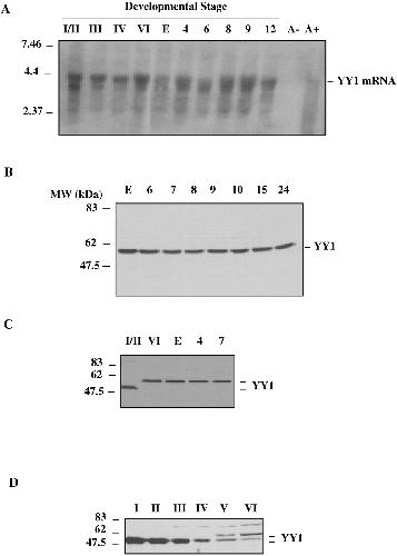 Expression of YY1 during Xenopusdevelopment. A, Northern blot analysis of YY1 mRNA expression during development. Each lane contains 10 μg of total RNA isolated from developing oocytes (stages indicated inRoman numerals), unfertilized eggs (E), and embryos (Arabic numerals). Positions of RNA markers are shown on the left. B, Western immunoblot of staged extracts from eggs (E) and embyros at various stages of development. C, Western immunoblot showing a comparison of YY1 expression in early and late oocytes and at stages of development around fertilization. D, Western immunoblot showing a comparison of YY1 expression during each stage of oogenesis. Positions of protein molecular weight markers are indicated at theleft of the panels.