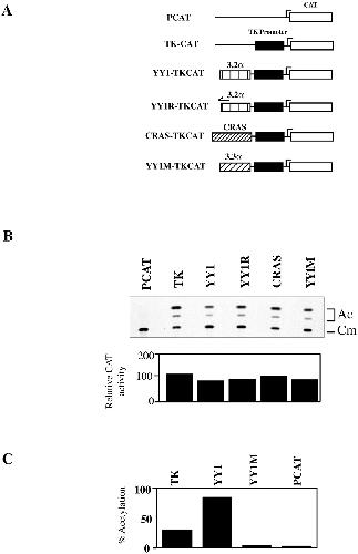 Transcriptional activity of YY1 in post-MBT embryos. A, diagram of plasmid constructs containing the CAT gene driven by the TK promoter and YY1 elements as described under “Experimental Procedures.” B, embryos were microinjected after fertilization with the indicated plasmid constructs and then allowed to develop to gastrula stage, at which point CAT assays were performed (upper panel). The experiment was repeated at least five times with different batches of embryos; a representative CAT assay is shown. CAT activity is expressed as a percentage of the highest relative activity (TK-CAT), which was arbitrarily assigned a value of 100 (lower panel).C, CAT assays of stable transfectant CHO cells. Constructs are indicated above the panel. Activity is presented as percent acetylation. The experiment was performed with triplicate sets of plates.