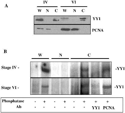 Subcellular localization of YY1 in oocytes. A, Western immunoblot of YY1 and PCNA in stage IV and stage VI oocytes that were manually dissected into nuclear (N) and cytoplasmic (C) fractions. W, indicates whole cell extract. B, gel mobility shift analysis of YY1 binding activity in whole cell, cytoplasmic, and nuclear fractions. Phosphatase treatments were done with 1 unit of calf intestinal alkaline phosphatase for 20 min on ice immediately prior to DNA binding reactions. The addition of antibodies for supershifts is indicated below the panel.