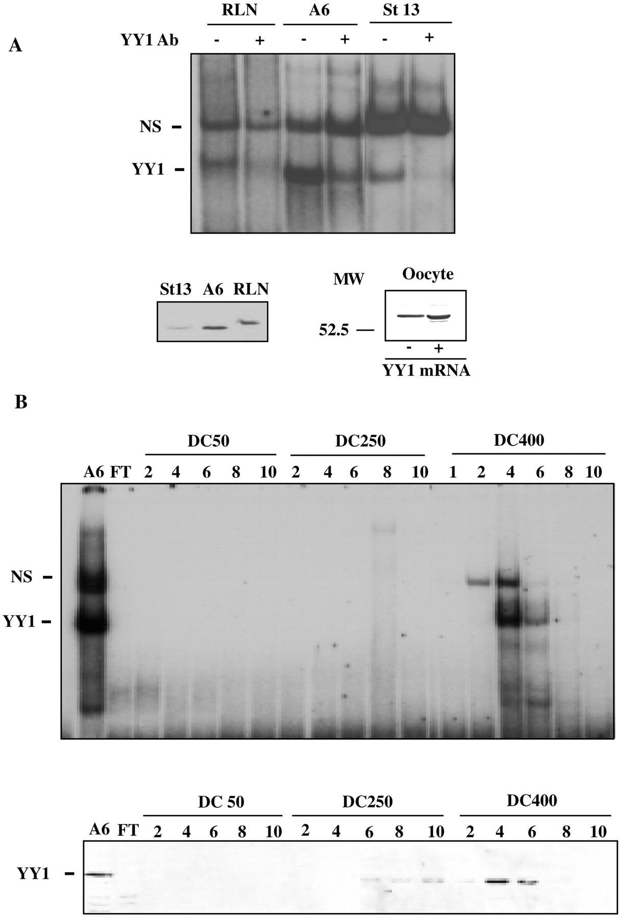 Identification of YY1 in Xenopuscells and embryos. A, upper panel, gel mobility shift assay of rat liver nuclear (RLN), A6, and neurula stage embryo (St 13) extracts with the α YY1 element. Antibodies were added to binding reactions as indicated above the panel. The positions of nonspecific (NS) and specific (YY1) bands are indicated on the left. lower panels: left, Western immunoblot of YY1 in extracts used for gel mobility shifts; right, Western blot of YY1 in oocytes that were not injected or microinjected with mRNA encoding Xenopus YY1. B, gel mobility shift assay (upper panel) and immunoblot (lower panel) of A6 cell fractions separated on a heparin-agarose column with increasing KCl concentrations. Fraction numbers are indicated above each panel. FT is the flow-through fraction.