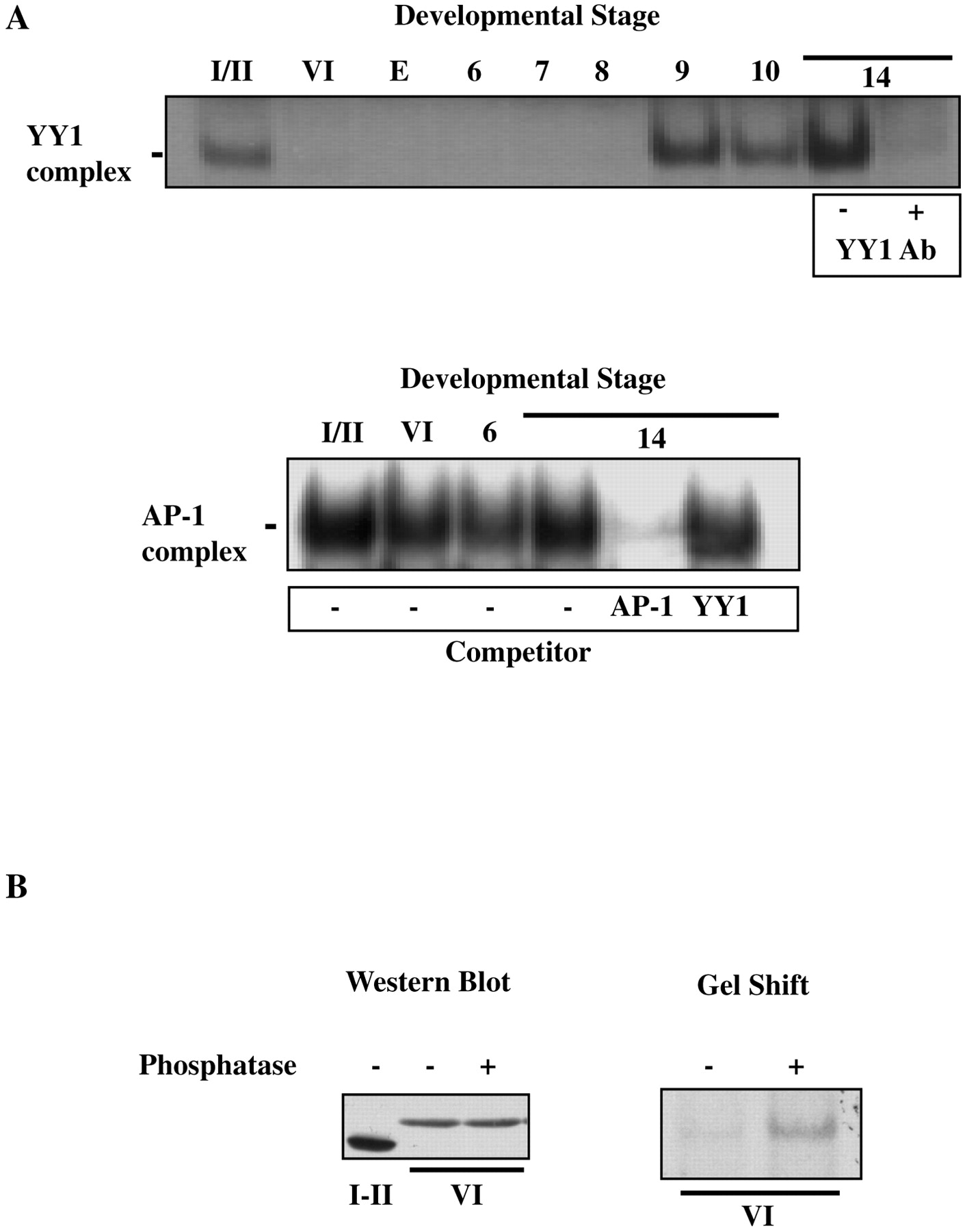 Alterations in the DNA binding activity of YY1 during development. A, upper panel, gel mobility shift analysis showing relative YY1 activity in staged oocyte and embryonic extracts. The addition of competitor YY1 antibody to DNA binding reactions is indicated below the panel. Lower panel, gel mobility shift showing relative AP-1 binding activity during development. The addition of unlabeled competitor oligonucleotides (50-fold molar excess) to DNA binding reactions is shownbelow the panel. B, stage VI extracts were treated with calf intestinal phosphatase, and the size of YY1 was compared directly by Western immunoblot (left panel) using YY1 polyclonal antibody. Aliquots of the same stage VI extracts were analyzed by gel mobility shift assay (right panel) with the YY1 probe.
