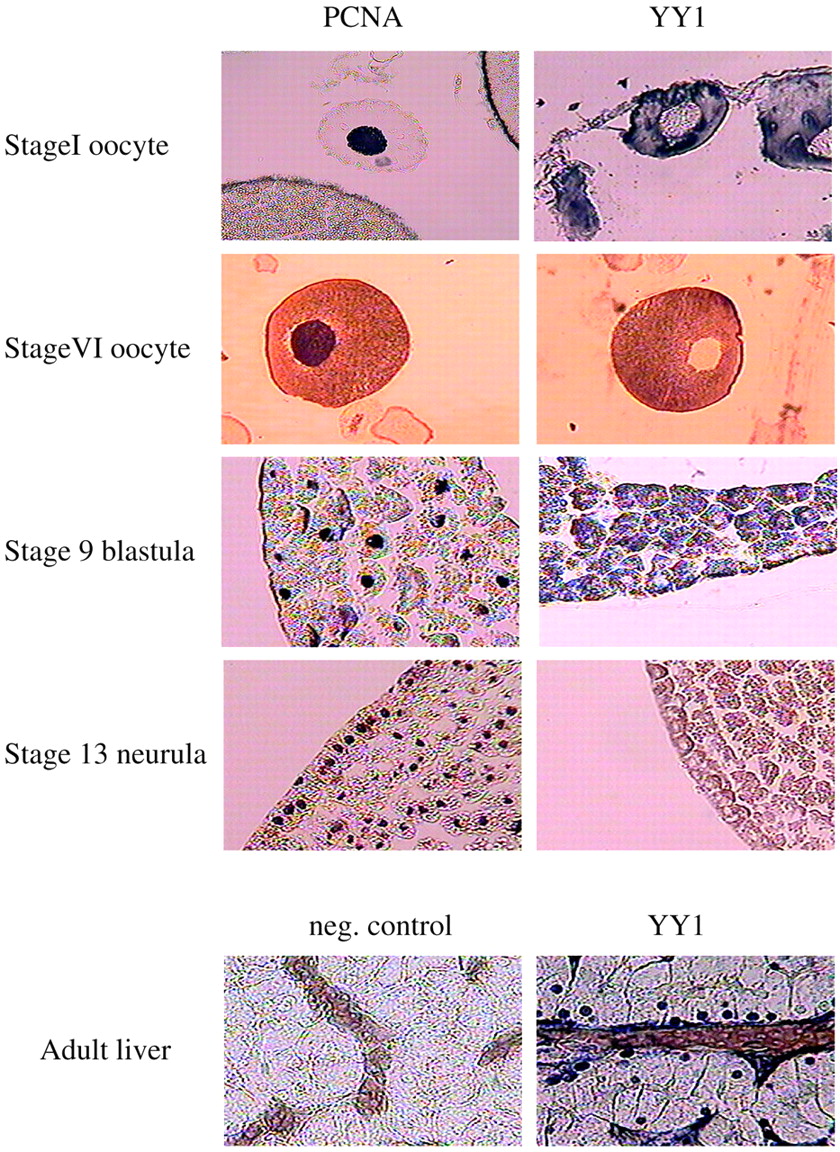 YY1 is a cytoplasmic protein in oocytes and embryos. An immunohistochemical analysis of YY1 and PCNA in oocytes and embryos was done. Oocyte and embryo stages are indicated at the left of each series of panels. In the stage 9 embryo panels, the dorsal part of the embryo is shown. In the neurula panels, the dorsolateral part of the embyro is shown. Thebottom panels show YY1 localization in hepatocyte nuclei of adult frog rat liver.