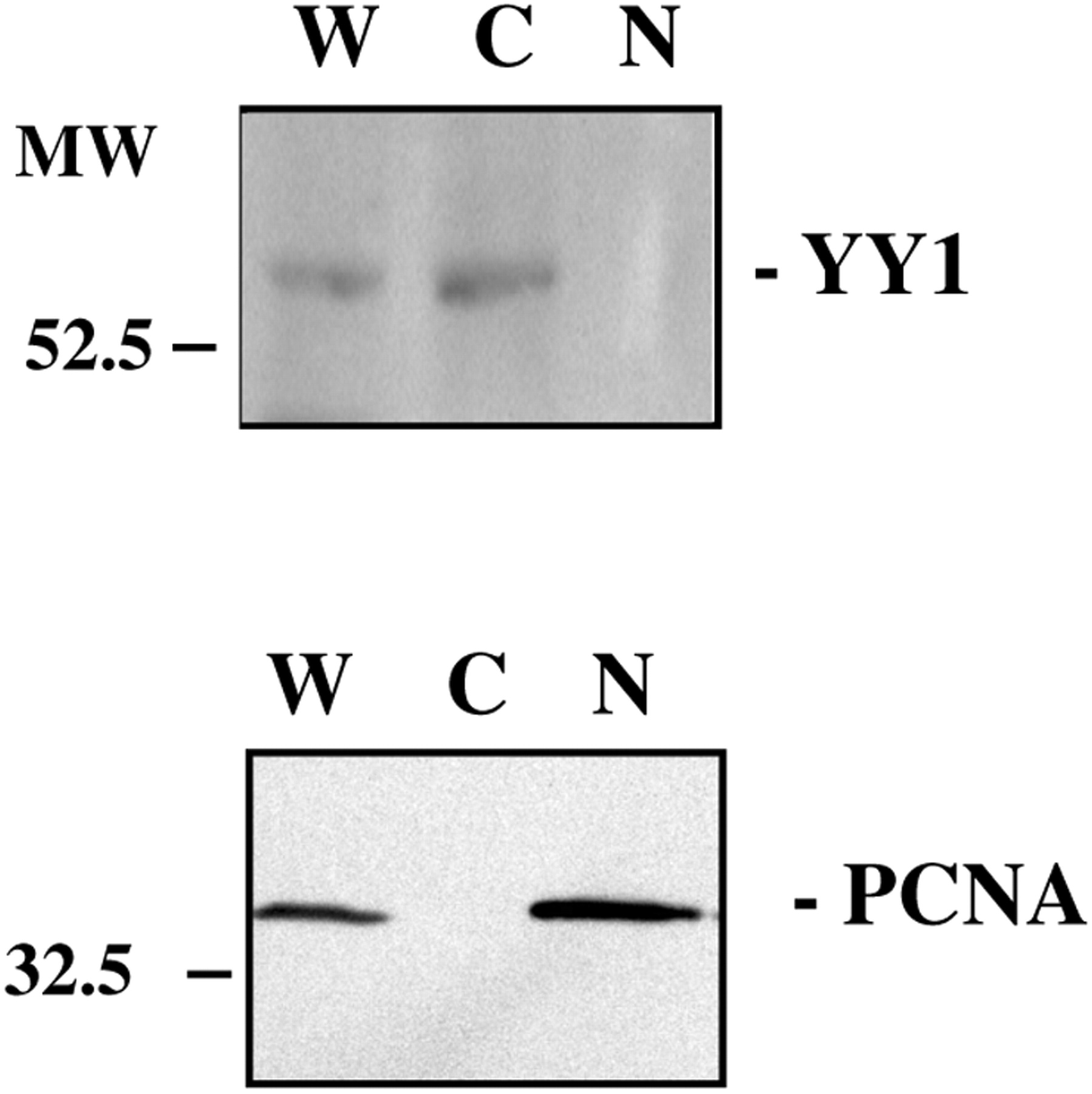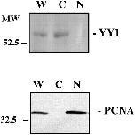 YY1 is detected only in cytoplasmic but not nuclear extracts of neurula stage embryos. Western immunoblot analysis of YY1 in whole cell (W), nuclear (N), and cytoplasmic (C) fractions obtained from stage 13 neurula embryos. An immunoblot of the same fractions using the PCNA antibody is shown in the lower panel.