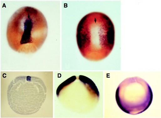 Fig. 1. Expression of three different forkhead genes during early Xenopus development. (A) In situ hybridization of XFKH1(FoxA4b) to a stage 12 Xenopus embryo (dorsal view). Expression is in the notochord (arrow). (B) In situ hybridization of XFKH7 to a stage 12 Xenopus embryo (dorsal view). Expression is in the presomitic mesoderm, and is absent in the notochord (arrow). (C) Transverse section of a stage 15 embryo hybridized with XFKH1(FoxA4b). Expression is in the notochord and neural floor plate. (D) Expression of XFKH7 in the trunk section of the stage 14 embryo. Expression is in the presomitic mesoderm, but it is absent in the notochord and the neural floor plate. (E) Expression of the XFD-13FoxF1b) in the trunk section of stage 15 embryo. Expression is in the lateral plate mesoderm. No expression is visible in the notochord and presomitic mesoderm. Expression is also absent in the most ventralmesoderm.