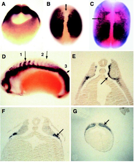 Fig. 3. Expression of XFKH7 during Xenopus development. (A) Transverse section of a stage 15 embryo showing a robust and uniform expression throughout the entire somite forming mesoderm. (B) A dorsal view of this stage 14 embryo demonstrates the expression of XFKH7 in the presomitic mesoderm and the absence of its expression in the notochord (arrow). (C) Whole mount in situ hybridization of a stage 18 embryo with the XFKH7 probe, demonstrates an intricate expression pattern of this gene at this stage. Although morphologically visible somites are not yet present, the expression of this gene clearly demonstrates a repetitive pattern of gene expression present in the presomitic mesoderm (arrow). (D) Whole mount in situ hybridization of a stage 25 embryo with XFKH7 (lateral view) demonstrating the complex expression pattern of this gene. Strong expression is present in the headmesoderm as well as in presomitic trunkmesoderm. Numbers with arrows indicate the position of transverse sections in Figs. 3E, 3F and 3G. (E) Transverse section through the anteriortrunk region (1) of the embryo in Fig. 3D. This section demonstrates the strong reduction of the expression in this part of the embryo in the somites. The remaining expression appears to be in the sclerotome (arrow). (F) Cross section through the mid-trunk region (2) of the embryo in Fig. 3D displaying a strong reduction of the expression in the somites. Only the most ventral part of the dorsal mesoderm is expressing this gene (arrow). (G) Transverse section through the posteriortrunk region (3) of the embryo in Fig. 3D. Presomitic mesoderm in the tail region is not yet differentiated and we can observe expression of XFKH7 in the entire presomitic mesoderm (arrow).