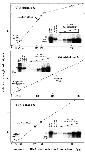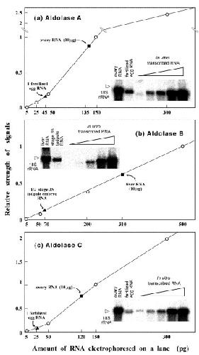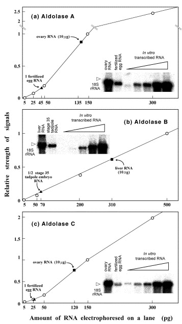 Fig. 1. Calibration curves obtained from Northern blot analysis performed with in vitro transcribed aldolase RNAs and RNAs from embryos and adult tissues. In vitro transcribed aldolase A, B and C RNAs appeared as signals of ca. 1.5, 1.5 and 1.8 kb, respectively, and aldolase A, B and C mRNAs in embryos and adult tissues appeared as RNAs of similar sizes (insets). Strength of each signal was determined by denstometry in an image analyzer (BAS 2500). (a) A calibration curve for aldolase A mRNA. Five, 25, 50, 150 and 300 pg of in vitro transcribed aldolase A RNA, total RNA of one fertilized egg, and total ovary RNA (10 μg) were analyzed. (b) A calibration curve for aldolase B mRNA. One-half, 5, 50, 200, and 500 pg of in vitro transcribed aldolase B RNA, total RNA from one-half embryo at stage 35, and total liver RNA (10 μg) were analyzed. A stage 35 tadpole contained ca. 150 pg of aldolase B mRNA. (c) A calibration curve for aldolase C mRNA. Five, 25, 50, 150 and 300 pg of in vitro transcribed aldolase C RNA, total RNA of one fertilized egg, and total ovary RNA (10 μg) were analyzed.
