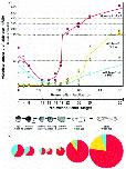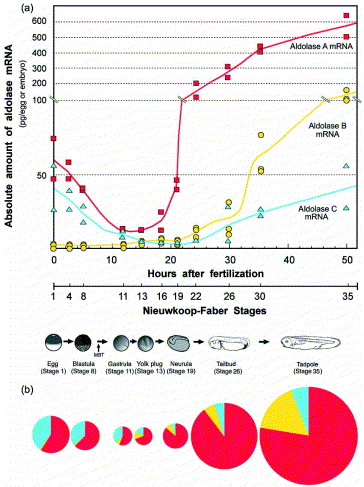 Fig. 2. Absolute amounts of aldolase A, B and C mRNAs in Xenopus laevis embryos during development. (a) The graph was drawn based on the results of Northern blot analyses of RNAs from embryos at different stages (data not shown, but see Kajita et al., 2000) and calibration curves obtained in Fig. 1. Two or three independent determinations were performed. From cleavage to the late gastrula stage the amount of aldolase A mRNA per embryo decreased from 60 to 15 pg, but it increased sharply thereafter to the level of 600 pg (at the tadpole stage). The period of this sharp increase corresponded to the period of somitegenesis. The amount of aldolase B mRNA (1.5 pg/egg) did not change until the midgastrula stage, but increased slightly at the late gastrula stage, then increased sharply at the tailbud stage to reach the level of 140 pg/embryo at the tadpole stage. The amount of aldolase C mRNA per embryo decreased from ca. 45 pg (egg) to ca. 3 pg (gastrula), and did not increase greatly in post-gastrular stages (50 pg/embryo even at the tadpole stage). (b) Circle graphs were drawn based on the data in (a). The difference in the size of the circle graph represents the difference in the total amount of the three aldolase mRNAs (A plus B plus C) at each stage.