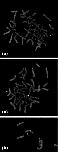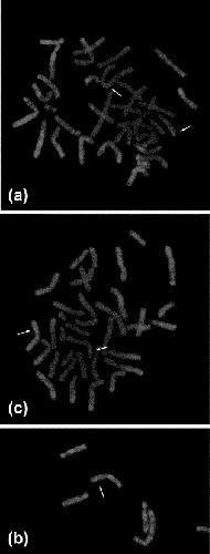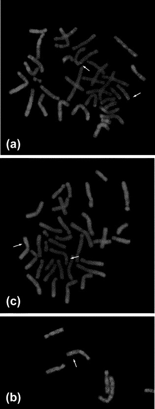 Fig. 5. Chromosomal localization of Xenopus aldolase genes. We examined at least 30 metaphase cells with clear twin-spot hybridization signals for each cDNA clone. There were 36 chromosomes in each nucleus. Top (a): a metaphase plate showing doublet signals (arrows) of aldolase A gene on the telomeric region of the long arms of a pair of acrocentric chromosomes. Middle (c): a metaphase plate showing doublet signals (arrows) of aldolase C gene on the middle portion of the short arms of a pair of large submetacentric chromosomes. Bottom (b): a metaphase plate showing doublet signals (arrow) of aldolase B gene on the short arm of a large submetacentric chromosome, which was confirmed by band pattern to be different from the chromosome which carries aldolase C gene. In the present data, we did not denote the number to each chromosome, since karyotype of Xenopus laevis has not yet been internationally standardized.