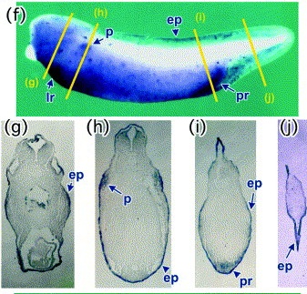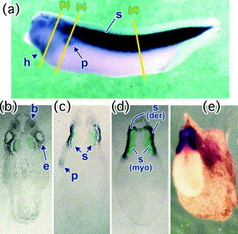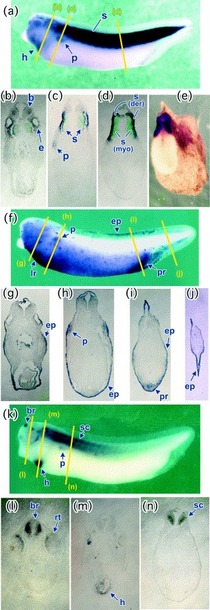 Fig. 3. Spatial expression patterns of aldolase A, B and C mRNAs examined in the wild-type Xenopus embryo at the tailbud stage (stage 35) by whole-mount in situ hybridization. Probes for aldolase A, B and C mRNA were, respectively, the HindIII fragment of XALDA (Hikasa et al., 1997), the AflII-XhoI fragment of XALDB2 (Kajita et al., 2000), and the SacI-KpnI fragment of XALDC (Atsuchi et al., 1994), which did not cross-hybridize to each other ( Kajita et al., 2000). All the signals were obtained with antisense probe, but not with the sense probe (data omitted). (a) An embryo hybridized with the XALDA antisense probe. Yellow lines indicate regions (bâd) where embryos were sectioned. h: heart anlage; p: pronephros, s: somites. In (b): b, brain; e, ear vasicle. In (c): s, somites; p, pronephros. In (d), somites are defferentially stained in dermatome (s (der)) and myotome (m (der)). (e) An embryo was fixed, cut into halves, and only the anterior half was hybridized with the XALDA antisense probe. Note the absence of difference in the staining between dermatome and myotome, indicating that the weaker staining in myotome in (d) is simply due to the lesser accessibility of the probe to it. (f) An embryo hybridized with the XALDB antisense probe. Yellow lines indicate regions (gâj), where embryos were sectioned. In (fâj): lr, liver rudiment; p, pronephros; ep, epidermis; pr, proctodeum. (k) An embryo hybridized with the XALDC antisense probe. Yellow lines indicate regions (lân) where embryos were sectioned. In (kân): br, brain; h, heart; p, pronephros; sc, spinal cord; rt, retina.