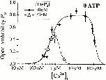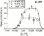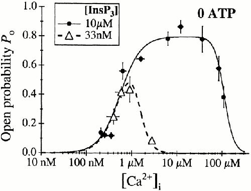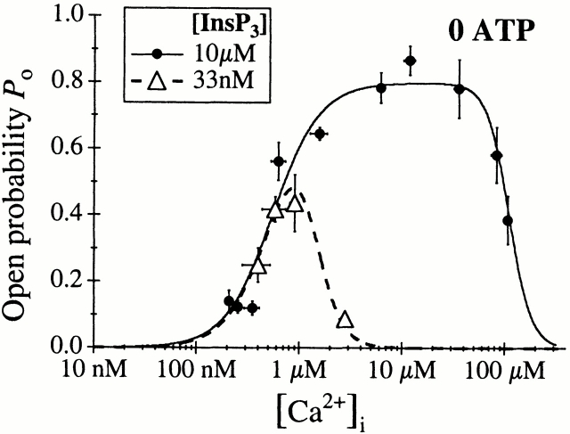 Figure 4. [Ca2+]i dependence of the Po of the X-InsP3R-1 channel in the absence of ATP, activated by saturating (10 μM) or subsaturating (33 nM) concentrations of InsP3. The solid and dashed curves are theoretical fits by the Hill equation () of the Po data.