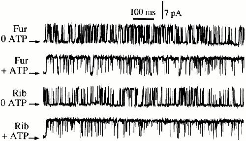 Figure 8. Typical single-channel current traces of the X-InsP3R-1 activated by 10 μM Fur or Rib. In 0.5 mM ATP (+ ATP), [Ca2+]i = 5.0 μM. In the absence of ATP (0 ATP), [Ca2+]i = 6.2 μM. The arrows indicate the closed channel current levels.