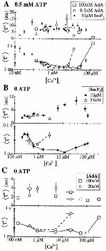 Figure 10. [Ca2+]i dependencies of the mean open (〈τo〉) and closed (〈τc〉) dwell times of the X-InsP3R-1 channel. In the 〈τc〉 graphs, data points from the same experimental conditions are connected with solid or dashed lines for clarity. (A) Channel activated by AdA or InsP3 (Mak and Foskett 1998), in 0.5 mM ATP. (B) Channel activated by saturating (10 μM) or subsaturating (33 nM) concentrations of InsP3 in the absence of ATP. (C) Channel activated by saturating (100 nM) or subsaturating (20 nM) concentrations of AdA in the absence of ATP.