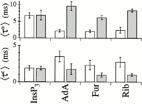 Figure 13. 〈τc〉 and 〈τo〉 of X-InsP3R-1 channels in optimal [Ca2+]i (4.4–6.2 μM) and saturating concentrations of various ligands in 0 (white bars) and 0.5 mM (shaded bars) ATP.