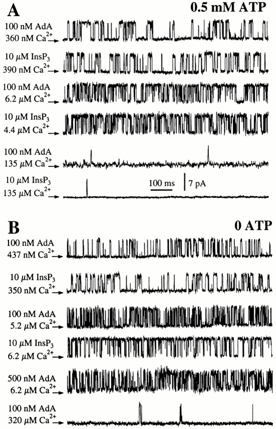 Figure 2. Typical single-channel current traces of X-InsP3R-1 in various [Ca2+]i, activated by InsP3 or AdA as indicated. Arrows indicate the closed channel current levels. (A) In the presence of 0.5 mM ATP. (B) In the absence of ATP.