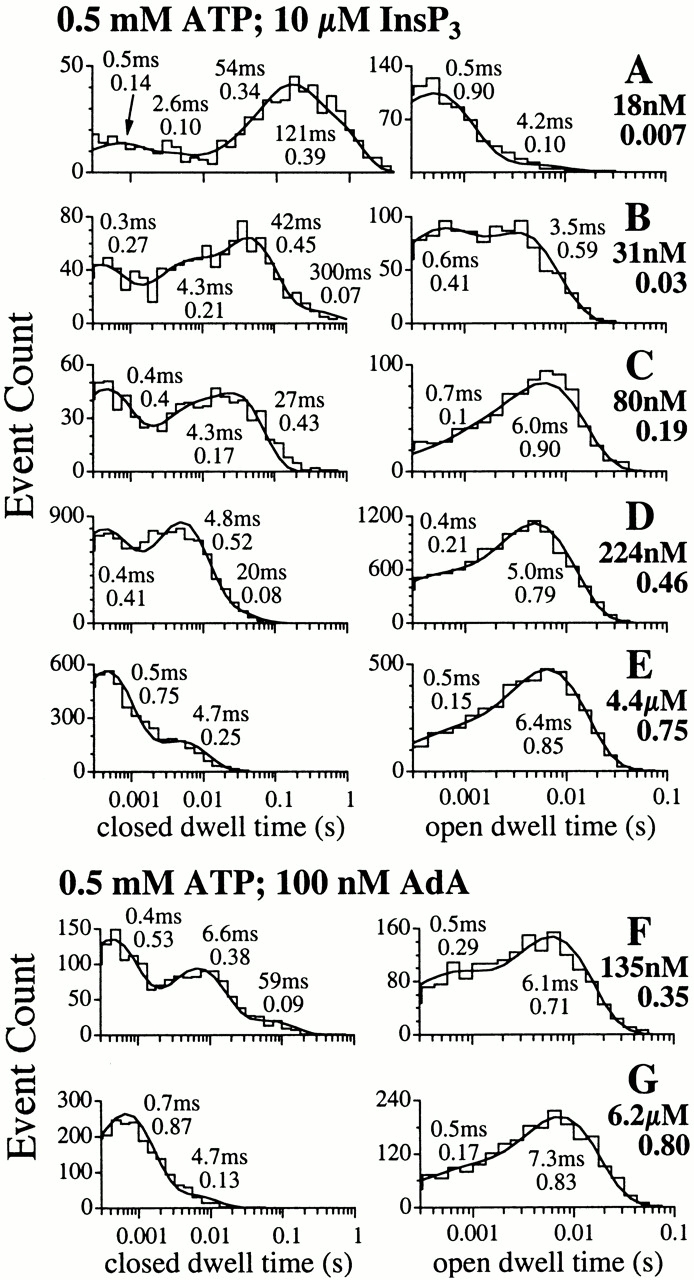 Figure 12. Open and closed dwell time histograms of the X-InsP3R-1 channel in the absence of ATP and various [Ca2+]i, activated by saturating concentrations of InsP3 (10 μM) or AdA (100 nM). The smooth curves are the pdf. The time constant and relative weight of each exponential component of the pdf are tabulated next to the corresponding peak in the curves. [Ca2+]i used in each of the analyzed experiments and its Po are tabulated next to the corresponding graphs.
