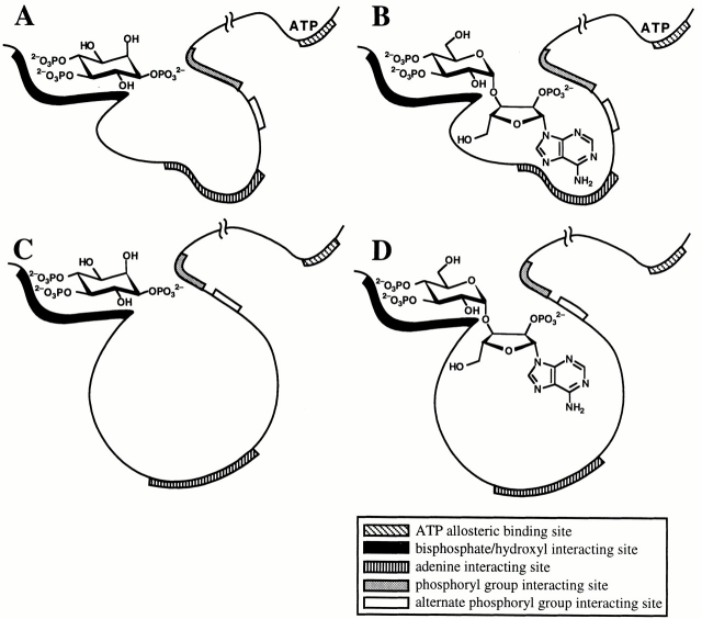 Figure 14. Schematic diagrams representing interactions between the X-InsP3R-1 molecule and various ligands. (A) Interaction between X-InsP3R-1 and InsP3 in the presence of ATP. (B) Interaction between X-InsP3R-1 and AdA in the presence of ATP. (C) Interaction of X-InsP3R-1 and InsP3 in the absence of ATP. (D) Interaction of X-InsP3R-1 and AdA in the absence of ATP.